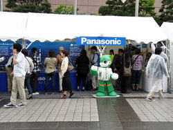ブースには、充電式電池「エボルタ」で動くロボット「エボルタくん」がトライアスロンを完走したことを紹介するコーナーや、同社のLED照明の紹介コーナーなども展開。各コーナーを回ると抽選に参加できるスタンプラリーも行われていた。また、スマートフォンユーザーらに向けたモバイルバッテリーの無料貸し出しも行っていた。