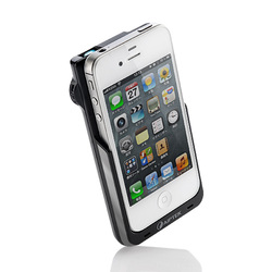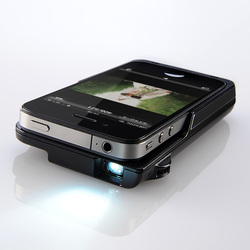 本製品はiPhone4/4Sのドックコネクター経由で接続するケース一体型のDLP式モバイルプロジェクター。外形寸法は68W×126H×20Dmm、質量は125g。Made for iPhoneを取得している。