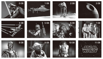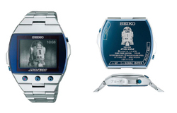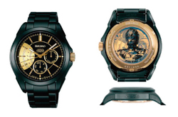 ラインナップは、ブラックを基調としたソーラー式電波時計の「ダース・ベイダーモデル」(税込141,750円)、ストップウォッチ機能を備えた「ダース・モールモデル」(税込136,500円)、セイコー独自の素材「SPRON510」を動力ぜんまいに採用した「ヨーダモデル」(税込136,500円)、「C-3POモデル」(税込136,500円)、「ストームトルーパーモデル」(税込136,500円)、そして7.2万ドット表示が可能な表示部を備え、映画の名シーンのグラフィックも楽しめる「R2-D2モデル」(税込126,000円)の6種類。