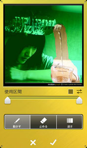 使用に際しては、まずアプリを起動後に2秒程度の動画を撮影。その後に、スマートフォンの画面をこすって動かしたい部分、動かしたくない部分を決定し保存すると、アニメーションgifでファイルが書き出される。なお、動かしたい部分は複数箇所を指定することも可能。作品は480×480ピクセルで作成される。