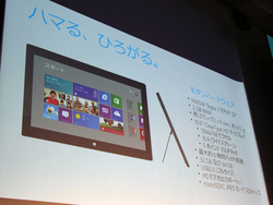 横井氏はSurface RTにキャッチコピー“ハマる、タブレット。”を冠したことを紹介。「単にタブレットとしてだけではなく、ノートPCとしての機能も持っており、新しい体験ができる製品だ」とし、Surface RTの製品概要を説明した。