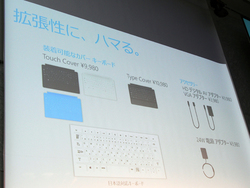 さらに、キーボードを備えた専用カバーアクセサリーも2機種をラインナップする。本体の厚さが3mmで、感圧式のキーボードを搭載する「Touch Cover」は、ブラック/ホワイト/シアンブルーが用意され、それぞれ9,980円前後での販売が予想される。本体厚さが6mmでハードキーボードを搭載する「Type Cover」も発売される見込みで、こちらは10,980円前後での販売が見込まれる。カラーはブラック。いずれも国内販売されるのは日本語版キーボードのみ。