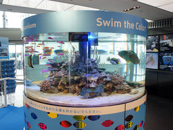 また、屋外のイベントスペース「ソニースクエア」や、館内数ヶ所には実際に水槽も設置。沖縄から移送されてきた様々な種類の魚たちを見学できるほか、期間中に土日限定で、実際にサメやエイに触れることのできる体験会も行う。