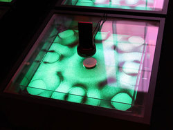 Fシリーズに今回のイベント用に作成した192kHz/24bitの音源を収録し、その音源が再生された振動で装置内の砂が動くことによって模様ができあがるという仕組み。来場者も実際にその音楽をウォークマンとヘッドホンで聴きながら、目の前で模様が変化していく様子を確認できるようになっている。