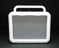 iPad miniなど7インチクラスまでのタブレット/スマホなどを入れて使える防水ケーススピーカー。最大で207W×144H×11Dmmまでの機器を収納して利用できる。機器と本機は、3.5mmステレオミニ経由で接続する。