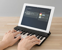 デザイン面では、iPadのケースにもなることが特徴。ケースとして使えるiPadはiPad 第2世代/第3世代/第4世代となる。プッシュボタンを押すことで、キーボードはフラットな状態から、飛び出す絵本のように白鍵と黒鍵がせり出してくる仕様を採用している。