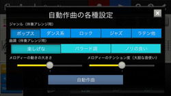 2小節のメロディを入力後は、「ジャンル(ポップス/ロックなど5種類を用意)」「曲調(楽しげな/バラード調/ノリの良い、の3種類)」「メロディーの動きの大きさ」「メロディーのテンション度」をそれぞれ選択し、イメージに合った曲を作っていく。1曲の長さは約30〜110小節。