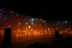 会場は銀座ソニービル8Fの「コミュケーションゾーンOPUS(オーパス)」。3層の布を円形にして会場全体を包み、その後ろに配置したロウソクに見立てた150本のライトと、プロジェクターによる映像で“優しい光”を演出。幻想的な空間を演出し、ハイレゾのバラードソングをゆったりと味わえるようにしている。