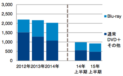 2015年上半期のセル映像ソフト市場(DVD/BD等を全て含む)は、数量が2,034万枚で、売上げが922億円となった。数量は前年比8%減、金額は前年比6%減と縮小が続いている。
