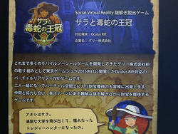Oculus社も昨年に引き続き出展しており、「Oculus Rift」や「GEAR VR」を体験可能。GREEがVR謎解き脱出ゲーム「サラと毒蛇の王冠」を出展しているなど、Oculus Riftを使ったVRコンテンツのデモを行うブースも多く見られた。