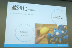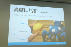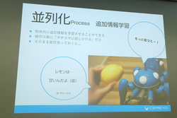 また特に大きなポイントとして、“並列化”が挙げられる。環境センサーに物体を見せ、「これはなに?」という風に聞くと、AI技術を用いた画像データベースをもとに、物体を判別。「バトーがどうしようもないことを教えて、整備係が苦悩するというシーンがあったが、その並列化を再現するために、物体別に追加情報を学習させることを考えた」という。