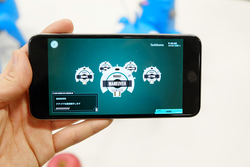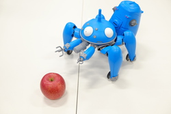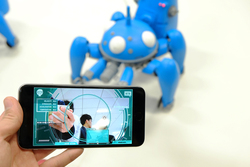 脚部下部には走行用車輪を備え、超信地旋回も再現できる。スマートフォンアプリからの走行可能で、タチコマの環境センサーの映像がリアルタイムに表示される。