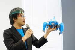 本日の展示ではまだ試作機となっているが、十分に完成機への期待が高まるものとなっている。価格が当初の予定より高くなったことについて「コミュニケーションロボットと並べたとして、さらに並列化の機能、ネット連携機能、そしてタチコマであることを考慮するとご容赦いただけるのでは」とコメント。