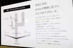 今回新たに発表した製品は、wena wristをさらに進化させた第二世代モデル。對馬氏は「wenaプロジェクトが理想とする“wear electronics natsurally"の実現にはまだギャップがある。そこで、wena wristの本流としてより高いクオリティで完成形を目指した『pro』、アクティブシーンにも使えるガジェットライクな『active』、もっと気軽に使えるアクセサリー要素を高めた『leather』を分流という位置付けとし、幅をもたせながら理想に近づくためのアプローチを展開する」と説明。今後についても「新しい機能を追加していくというより、選別しながら載せた今の機能をさらに深めていきながら、事業を大きくしていきたい」とした。