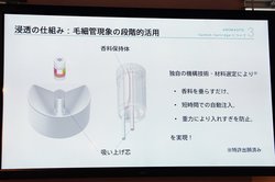 精油をカートリッジに浸透させる仕組みには、「上から注入させるスタイルだと、精油の分量が多すぎた際にうまく処理することができず、適量を浸透させることが難しかった」とのことで、毛細管現象を段階的に活用したという特許技術を用いているという。