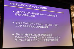 具体的には、アバターを取り扱うために必要な機能の拡張と、使いやすくするための制約を設けてあるとのこと。例えば、VR上において3Dアバターを1人称視点にする場合、従来は3Dアバターの内側が見えてしまっていたのに対し、VRMでは1人称視点では内側は描画させない、といった仕様になっているという。加えてテクスチャ・マテリアルが1つのファイルにまとめられることで、非常に使いやすくなっているという。