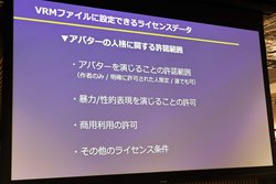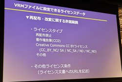 また前述した「3Dアバターはいったい誰なのか」という問題に対しても対策が行われている。これにより、製作者専用なのかといった許諾範囲、暴力表現などの許可、商用利用の可否などのライセンス情報をファイルに入れることができる。さらにクリエイティブ・コモンズ・ライセンスを組み込むことも可能で、定型化されたライセンスから選ぶといった方式にすることでプログラムから判定できるとしている。