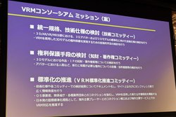具体的な活動内容はまだ確定していないとのことだが、発表会では団体が担うミッション案が3つ挙げられた。1つめは「統一規格、技術仕様の検討」。これは3Dアバター・モデルなどの標準化に向けた技術仕様の検討を行うほか、VRMを使用した3Dモデルの権利保護を実現するための技術的手法の検討を行うというもの。