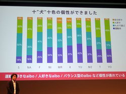 発表会で登壇したソニーの川西氏は、aiboはオーナーと一緒に生活していくことでAI学習によって個体ごとの性格に差が現れることを改めて紹介。例えば、より親しい人には決めポーズを多く見せたり、本物の犬のようにオーナー家族のなかでも人を順位付けするなど “十犬十色” の個性を持つように成長すると説明する。