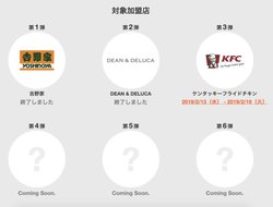 12月に実施された第一弾では、吉野家にて牛丼並盛り1杯が半額となるキャンペーンを実施(関連ニュース)。続いて第二弾ではDEAN & DELUCAが対象になっていた(関連ニュース)。今後も順次キャンペーンが予定されている。