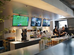 テラスやソファ席やカウンターなど、約60席ほどを用意。プロジェクターとスクリーンによる「BIG SCREEN ZONE」、プロジェクター1台とテレビ2台でリビングに模したスペースを3つつくった「LIVING ZONE」、テレビが3台ある「bar ZONE」、そしてテラス席という4つのゾーンが設けられている。
