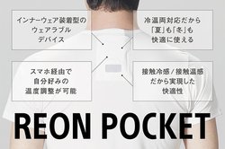 REON POCKETは、専用インナーウェアの首元にある背面ポケットに端末を装着し、スマートフォンアプリで端末の温度調整をすることで快適性を得られるという、冷温両対応のウェアラブルデバイス。「ソニーのテクノロジーを活用した新たな快適性の提供」をコンセプトにビジネスパーソン向けに開発され、名称の「REON(レオン)」は「冷温」から名付けたとこと。