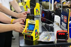 会場に置かれたゲーム機は、すべてオリジナルに対して小さい。ゲームセンターで大ブームを起こした筐体たちをベースにデザインされつつ、手のひらサイズまで凝縮された「レトロアーケード」シリーズでは、『パックマン』や『ギャラガ』などのタイトルがずらり。