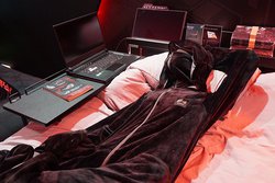 「ゲーミング着る毛布」が発売後即完売するなどスマッシュヒットを飛ばしたバウヒュッテは、その「ゲーミング着る毛布」の2019年の新作を着たマネキンが「ゲーミングベッド」に寝ているなど、一風変わった展示を展開していた。