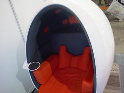 オーディオハートは、“パーソナルホームシアター用チェアスピーカー”と銘打つタマゴ型のシステム「VRS-1」と「VRS-2」を展示。「VRS-1」が内部に11.2chサラウンドスピーカーを装備する上位モデル、「VRS-2」は7.2chにして価格も抑えたモデルだ。昨年は「VRS-1」のみの展示だったが、今回は「VRS-2」も体験できるようにしていた。