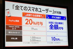 キャンペーンでは、1回の決済につき1,000円相当、1日の合計で5,000円相当を上限として、支払額の最大20%をPayPayボーナスで付与。これまでの同社のキャンペーンではユーザーごとに還元率が異なっていたが、今回は一律で20%となっている。なおクレジットカードは対象外だが、ヤフーカードでは19%としている。