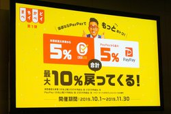 補足すると、今回のキャンペーンは10月1日の消費増税と同時開始される、政府主導の消費者還元補助と合わせて20%になっている(中小・小規模事業者が経営する対象店舗では5%・フランチャイズでは2%と規定)。そのため、5%還元対象店舗では+15%、2%還元では+18%が今回のキャンペーンで追加されるかたち。なお後述する「まちかどペイペイ」など、他キャンペーンとは重複されない。