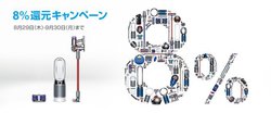 コードレス掃除機や“羽根のない”扇風機で有名なダイソンは、9月30日までの期間で8%相当額を還元するキャンペーンを行っている。コードレス掃除機をはじめ、ハンディクリーナー、ロボット掃除機、扇風機、デスクライトなど多くのモデルが対象だ。