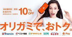 スマホ決済のOrigamiでは、ヤマダ電機グループ全店舗での支払いが10%オフになるキャンペーンを9月30日までで開催(関連ニュース)。ヤマダ電機/ベスト電器/マツヤデンキ/ツクモ/キムラヤが対象で、各店舗の初回の支払いが10%オフになる。なお、1回の支払いでの割引額は最大3,000円。