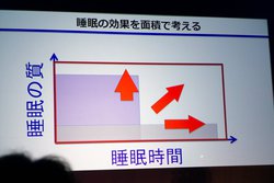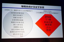 そのほか発表会では、早稲田大学 リサーチイノベーションセンター 研究戦略部門 教授 枝川義邦氏による講演も行われた。この中で同氏は、「6時間睡眠を毎日続けると、1週間で一晩の徹夜、2週間で二晩の徹夜と同じ状態になる。6時間睡眠は習慣になりやすいが、徹夜明けと同じような状態が続いてしまう」と説明した。
