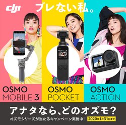 DJIは、人気のOsmoシリーズ「Osmo Action」「Osmo Pocket」「Osmo Mobile 3」と、折りたたみ式ドローン「Mavic Mini」のセットが抽選で3名に当たる、「アナタならどのオズモ?」キャンペーンを開催する。期間は2019年12月6日(金)から2020年1月31日(金)まで。