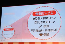 金融サービスでは、個人向けローン、ビジネスローン、投資、後払い、保険を行うとのこと。「ユーザーに選ばれる金融サービスとして、ユーザーにとって一番良いサービスをスピーディーに展開していきたい」と話しており、自社他社を問わないオープンな姿勢で、マルチパートナーと展開していくという。