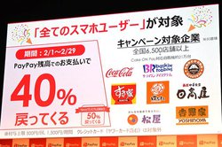 PayPayは、全国6,500店舗以上の有名飲食チェーンや21万台以上の自動販売機での支払いをPayPayで行うと、40%のPayPayボーナスが戻ってくる「『40%戻ってくる』キャンペーン」を2月1日午前0時から2月29日午後11時59分まで実施する。