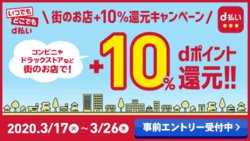 また、街のお店 d払い+10%還元キャンペーンでは、対象の店舗でコード決済をすることで、通常のポイントに加えて10%のdポイント(期間・用途限定)を進呈する。