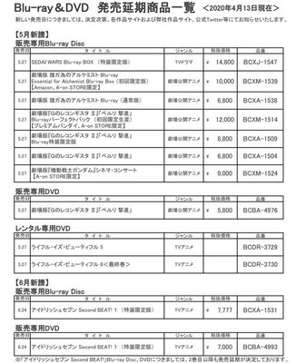 他作品では、「劇場版 誰ガ為のアルケミスト」「劇場版 Gのレコンギスタ II ベルリ撃進」「劇場版『機動戦士ガンダム』シネマ・コンサート」など5月に発売を予定していた作品の発売を延期。音楽作品でも、4月29日発売予定だった “れるりり” ニューアルバムや「THE IDOLM@STER MILLION LIVE! 6thLIVE TOUR UNI-ON@IR!!!! SPECIAL LIVE」ブルーレイ各種など、ランティスおよびキラミューンレーベルの作品の発売を延期する。