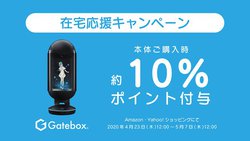 また、AmazonやYahoo!ショッピングにてGateboxを購入すると本体価格の約10%のポイント付与を行う「在宅応援キャンペーン」を4月23日12:00から5月7日12:00の期間限定で行うことも合わせて発表された。