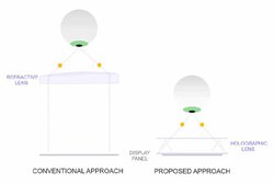 ホログラフィック光学系では、クレジットカードに使われるホログラムと同じような仕組みを用いる。光学系にレーザー光と物体との相互作用を記録することにより、薄くて透明なステッカーのような物体で、レンズのように光を曲げることができるという。