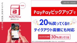 加えて、6月にスタートした飲食店の事前注文サービス「PayPayピックアップ」で20%が戻ってくるポイントバックキャンペーンも実施。付与上限は500円相当/回・5,000円相当/期間で、PayPay残高での決済が対象。Yahoo!プレミアム会員は30%に増額される。