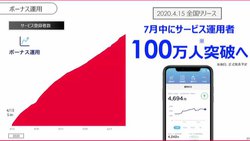 今後の戦略については、マネタイズに向けた取り組みとして、試験的に開始している後払いサービスついて秋に正式提供を予定する。その他のサービスについても、予定されているものを順番にリリースしていく段階。すでに開始しているボーナス運用は今月中には運用者が100万人を超える推移だという。