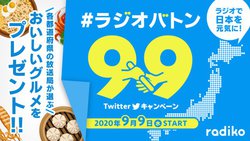 これを記念して9月9日から2020年11月末までの間、Twitterキャンペーン「#ラジオバトン99」を実施する。期間中、radikoの公式Twitterアカウントから99局分投稿される各放送局の対象ツイートをリツイートすることで、各放送局が選んだ「イチ押しグルメ商品」が抽選であたるというもの。また応募の際、ハッシュタグ「#○○の聴きどころ」(○○は各局の局名) をつけてツイートすることで当選確率が2倍となる。