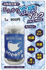 価格は1枚800円(税込)。専用のビンケースに入れ、他の清涼飲料水と同じく冷却した状態で提供される。マスク本体はSEKマーク/繊維製品認証を受けたエアロシルバー素材の、抗菌効果・吸湿速乾・消臭効果・遠赤外線放出・UVカットの機能を備えた接触冷感生地で、洗濯し繰り返して使用することが可能だ。