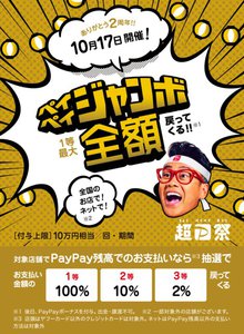 開催初日の10月17日には、PayPayのサービス開始2周年を記念し、対象のオンライン/実店舗でPayPay残高、Yahoo! JAPANカードまたはPayPayあと払い(一括のみ)での決済を行うと、抽選により最大で決済金額全額分のPayPayボーナスを付与する「超PayPay祭!オープニングジャンボ」を1日限定で実施する。