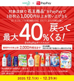 PayPayは、対象店舗で税込1,000円以上の花王商品を購入すると、購入額の最大40%がPayPayボーナスで付与される「花王商品の購入で最大40%戻ってくる」キャンペーンを12月1日から31日まで実施する。