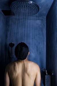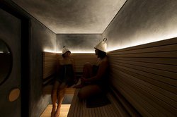 サウナは室温70度前後で湿度は高め。横になれる長さ2mのベンチを備えている。壁や天井はダークグレーで統一されており、照明も間接照明のみで、外界からの刺激をなるべく少なくしているとのこと。水風呂はないが400口径のオーバーヘッドシャワーが用意されており、10〜15度前後の冷水を浴びることが可能。クールダウン後は用意されたアームチェアで微風を浴びながらリラックスできる。