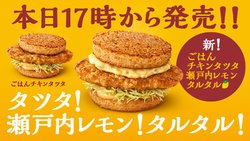 さらに、バンズの代わりにごはんで具材を挟み込む「ごはんバーガー」からも「ごはんチキンタツタ」、および新メニュー「ごはんチキンタツタ 瀬戸内レモンタルタル」が期間限定で登場。価格は「ごはんチキンタツタ」が単品440円、バリューセット740円。「ごはんチキンタツタ 瀬戸内レモンタルタル」が単品470円、バリューセット770円。