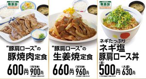 定番メニュー「豚肩ロースの豚焼肉定食」「豚肩ロースの生姜焼定食」 「ネギたっぷりネギ塩豚肩ロース丼」の肉を最大1.5倍に増量するキャンペーン。